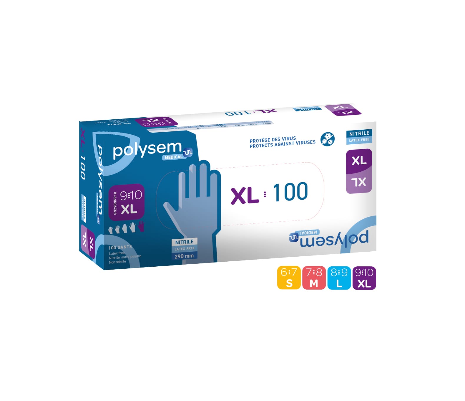 Dėžutėje yra 100 pirštinių, nitrilo medicininės pirštinės yra 4 dydžių: S, M, L, XL