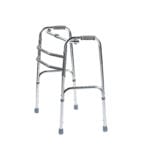 | Šis lengvas, žingsniuojantis vaikščiojimo rėmas skirtas laikinos ar ilgalaikės judamojo-atramos aparato disfunkcijos kompensavimui, pritaikytas kasdieniam judėjimui patalpoje ar lauke naudotojui iki 100 kg svorio. Sutelkus kūno svorį vienoje pusėje ir atsirėmus viena ranka į atramą antra ranka perkeliama kita rėmo dalis. Tokiu būdu – pakaitomis, remiantis tai kaire, tai dešine ranka, žingsniuojama. Naudotojas turi stengtis stovėti tiesiai, simetriškai. Rėmas pagamintas iš aliuminio vamzdžių, padengtų blizgančia anodine danga. Rėmo kojelės – su guminiais, neslystančiais ir grindų nebraižančiais antgaliais. Aukštį nuo grindų iki laikymosi rankenos dalies reikia nustatyti tokį, kad rankos būtų šiek tiek sulenktos per alkūnes – tai galima patogiai padaryti vieno mygtuko paspaudimu. Rėmas parduodamas pilnai surinktas ir paruoštas naudojimui. Norėdami jį išskleisti laikykite už paminkštintų atramų rankoms ir palengva lenkite abi atramas į priešingas puses, kol išgirsite spragtelėjimą ir rėmas įgaus pusapvalę formą. Suskleisdami rėmą nuspauskite viršuje esantį plastmasinį laikiklį ir užlenkite į vidų abi rėmo puses. Kiekvienas žingsniuojantis vaikščiojimo rėmas gamykloje patikrinamas, todėl naudotoją pasiekia tik kokybiškas ir pilnai surinktas gaminys. Rėmą valykite drėgnu skudurėliu, nenaudokite agresyvių valymo priemonių ir tirpiklių. |